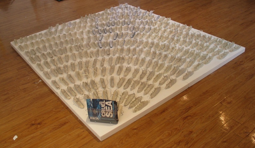 This installation is made from the pages of two copies of the Cruel Sea – two copies to represent the two ships in the book.